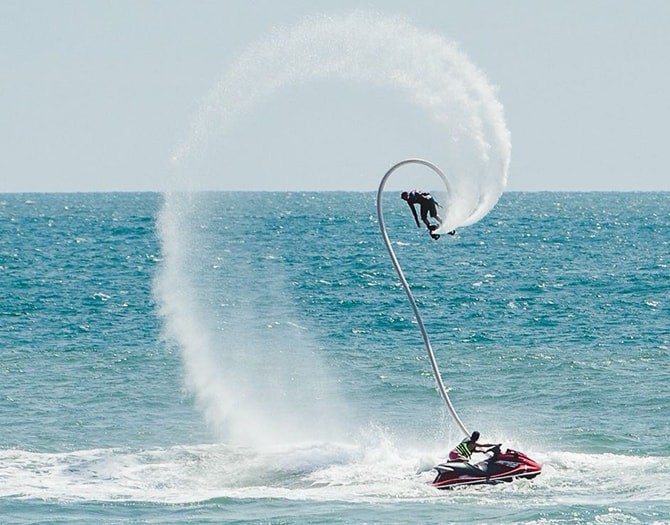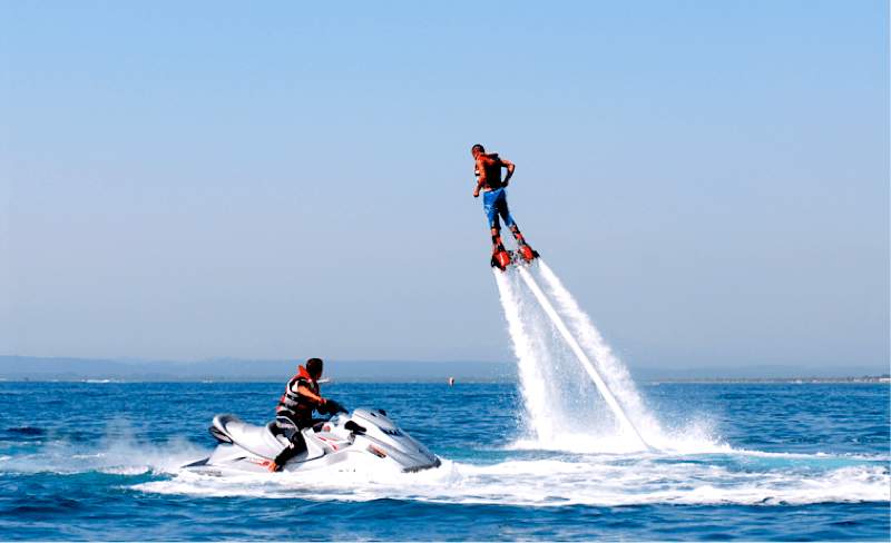 La experiencia más de moda en deportes acuáticos. Es fácil de aprender y divertido. Este ingenioso y simple aparato utiliza un potente motor de una moto de agua. El chorro de agua recorre de una larga manguera que se conecta a un par de botas y estabilizadores de mano.