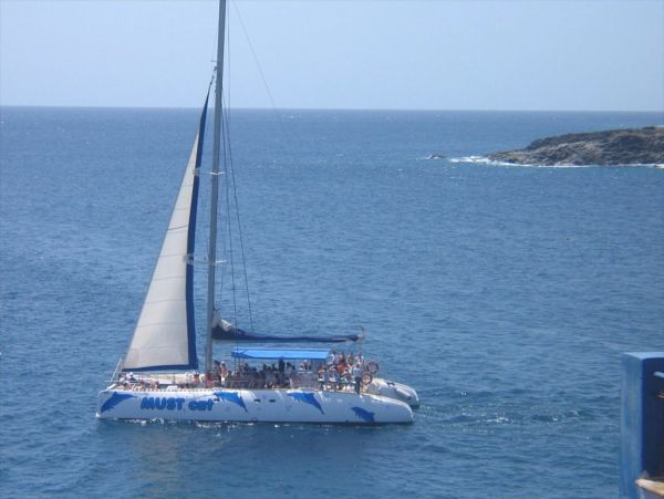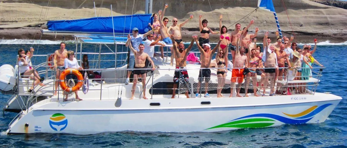 Viaje a bordo de el barco Must Cat por las maravillosas costas de la isla de Tenerife. Plácido avistamiento de delfines y ballenas.