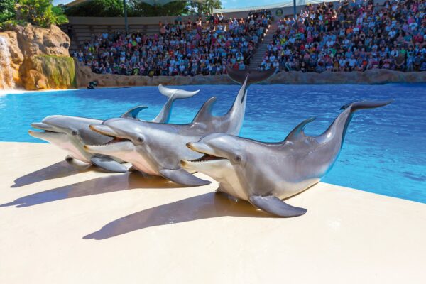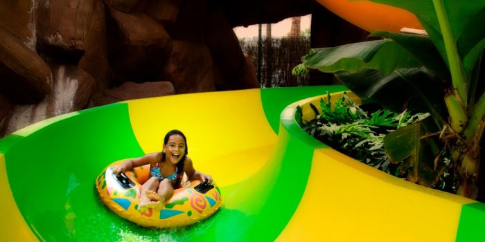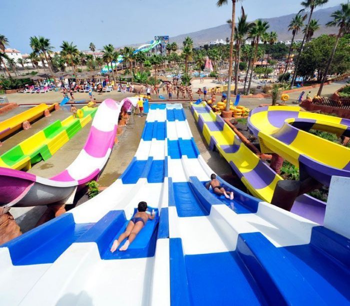 Aqualand es un parque acuático lleno de diversión en Costa Adeje, en el Sur de Tenerife, que ofrece una increíble variedad de atracciones para todos los miembros de la familia. Le subirá la adrenalina al probar todas las atracciones con vertiginosos descensos en este atractivo parque acuático. Flying Boats: dos toboganes en espiral que caen uno dentro del otro en cuatro niveles diferentes. Acepte el reto y compita con sus amigos en el Twister Racer, un tobogán de 4 pistas y 14 metros de altura, o en el Multi-surf, un tobogán de 6 pistas de 16 metros de altura con una emocionante caída de 100 metros. Para un paseo fantástico, suba al Tornado donde deslizará circularmente hasta caer en un orificio inferior y caer en una piscina. Si quiere desafiar la velocidad, pruebe los Kamikazes y los toboganes Rápidos. Los niños seguramente disfrutarán de las diferentes atracciones, sobre todo los jóvenes. Podrán hacer su propia carrera en Crazy Race Junior con 3 pistas y un hermoso castillo de cuento de hadas. O también pueden ir a las piscinas mágicas de Dragon Land y Forest Land, un laberinto de escaleras y toboganes y sorpresas acuáticas que los esperan en el Castillo del Agua. Otras piscinas y toboganes también están disponibles no solo para los niños sino para el resto de la familia. Las estrellas de Aqualand son los delfines en el Delfinario. En cada exhibición los delfines mostrarán sus habilidades físicas y mentales. También puede visitar el Dolphin Planet para descubrir más sobre su historia, características, fisiología y hábitat. O reserve un Dolphin Encounter para conocer e interactuar con ellos.